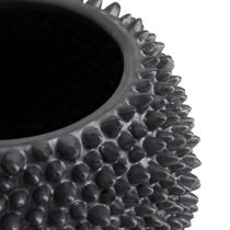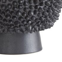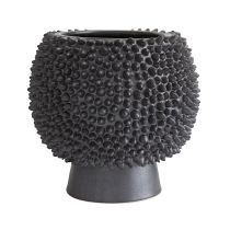Sporting a heavily textured wildly unique façade the Daria is absolutely eye-catching. Ceramic is crafted in a fashion reminiscent of jackfruit with tiny spikes that cover its matte black-finished surface which is mounted on a matte black base We see this piece displayed with a bouquet of small blooms or showcased solo as an eccentric centerpiece. Pair with the shorter version to deliver an even more textural appeal. Watertight.